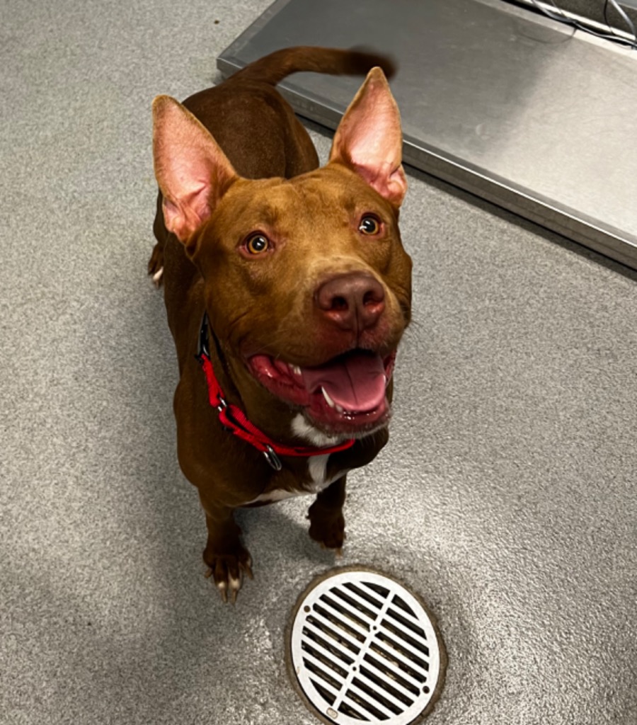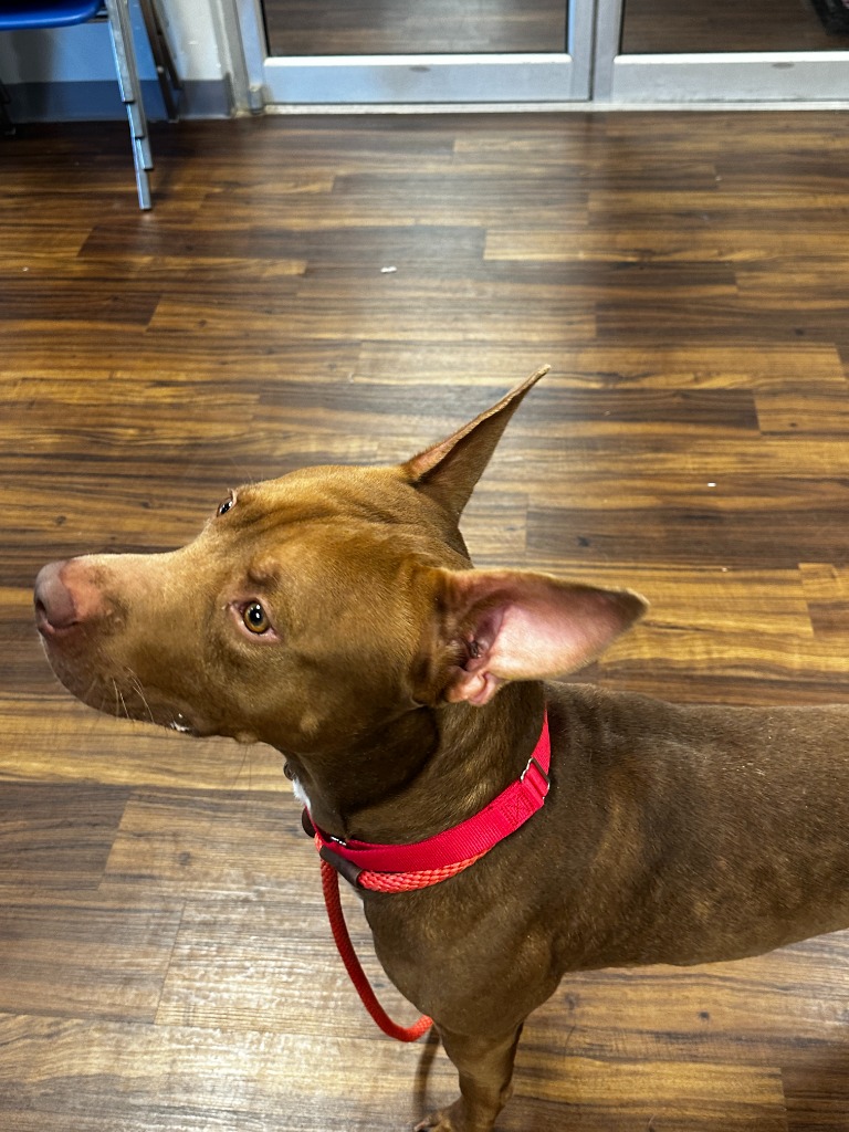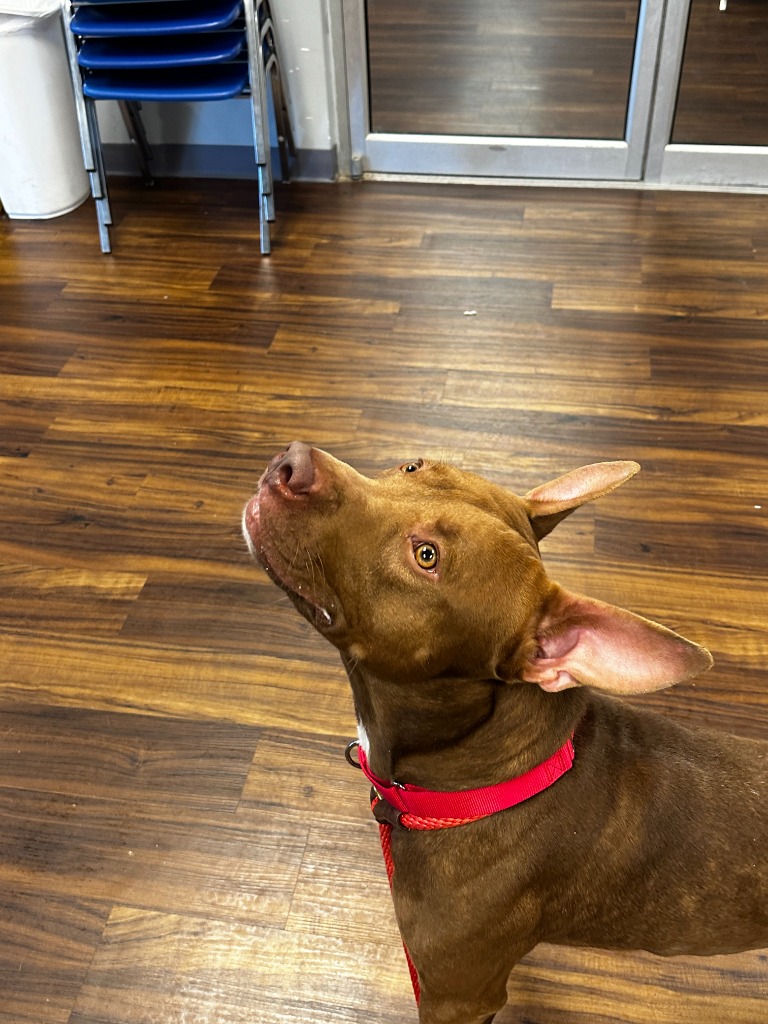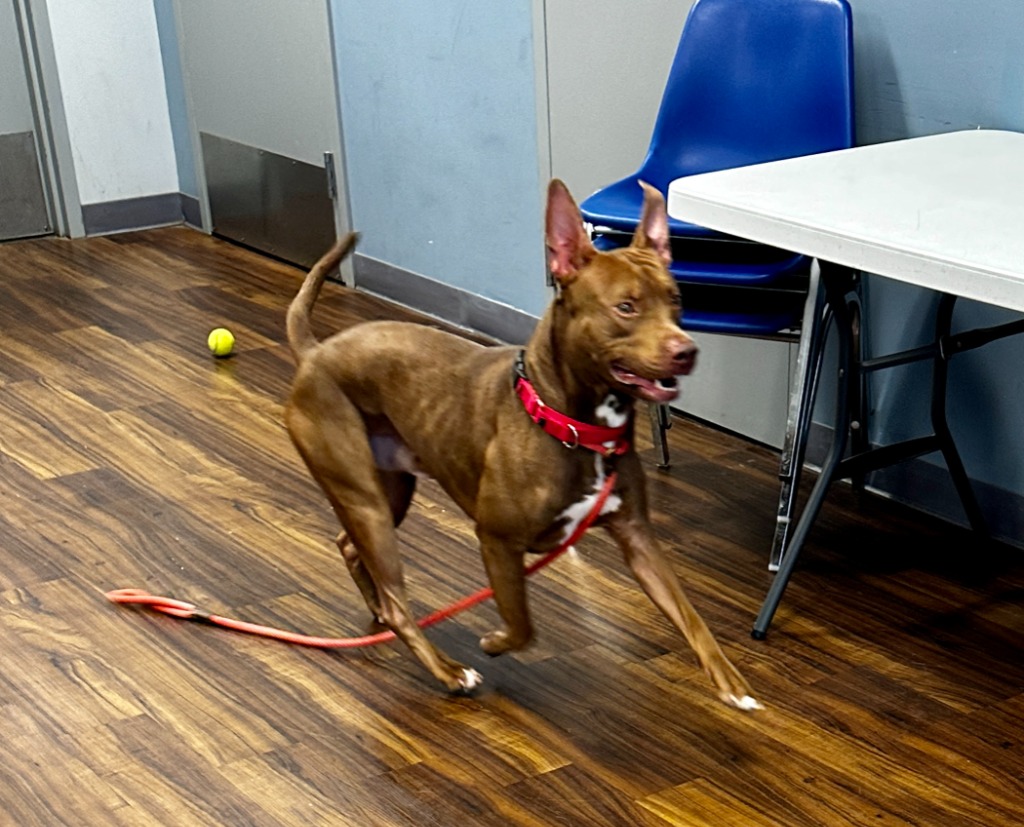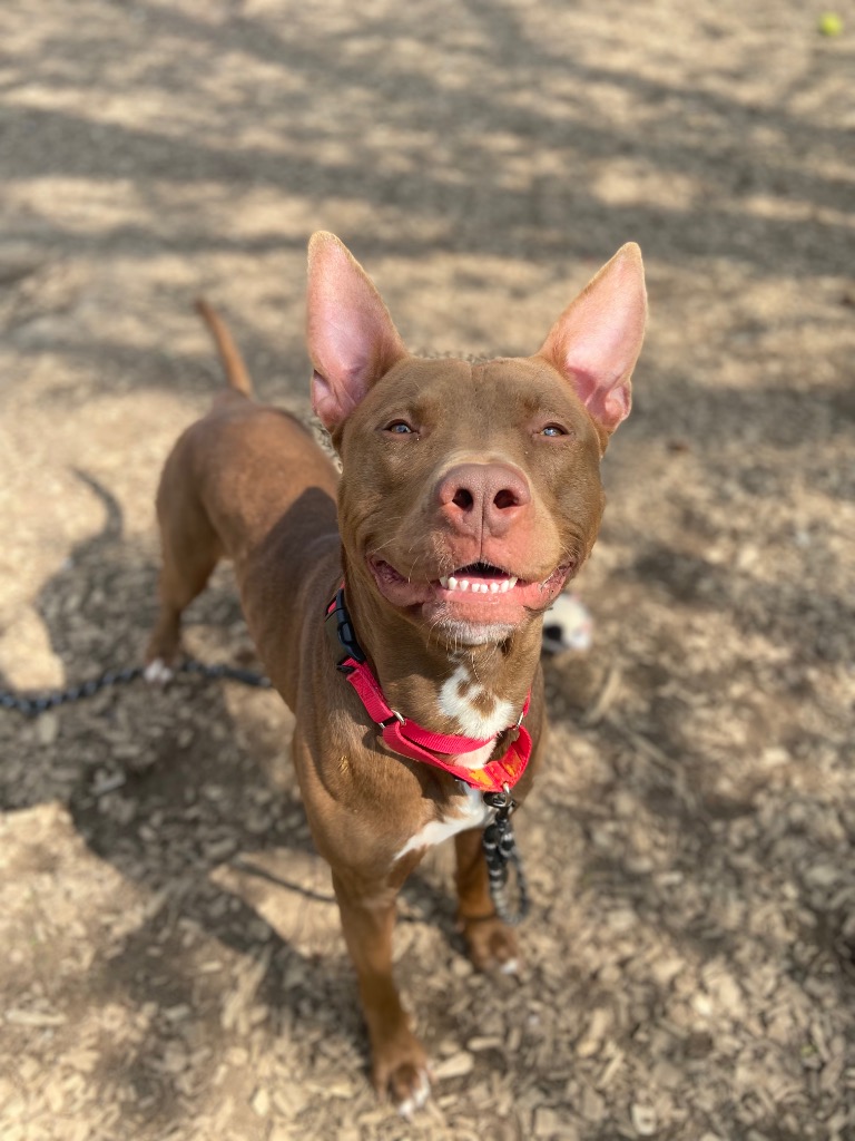 Bossman has ears that are large and in charge, just like him! He is a young guy with BIG energy that he hasn't figured out how to channel quite yet. He is extremely toy motivated and loves to chase his stuffies around the yard. He also enjoys snacks and seems to have a few basic cues under his belt. Bossman does get overstimulated at times and will jump up high. He is working hard to regulate his excitement more appropriately, but he would really love a human that can continue teaching him the best manners and finding outlets for his energy!