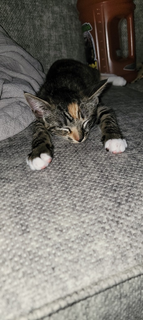 With her diamond shaped face, split color nose, and paint dipped tail, Banjo is a unique tabby-calico. She's a fierce bug hunter and hair tie thief. She spends her days entertaining herself by proving anything can be a toy- grocery bags, bottle caps, a fallen leaf, or even the purchased cat toys. To expend any excess energy she finds herself with, Banjo will spend a few minutes vigorously chasing her own tail or expertly speed climbing a cat tree. She's an independent cat who likes to nap in the same room as her humans, but isn't always up for cuddles. She is constantly looking for the attention and approval from the older cats who are aloof to her kitten energies. Banjo would love to bring her playful antics to your house!