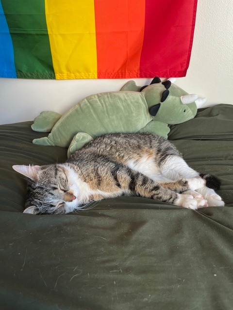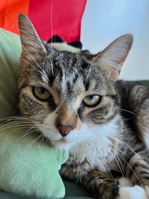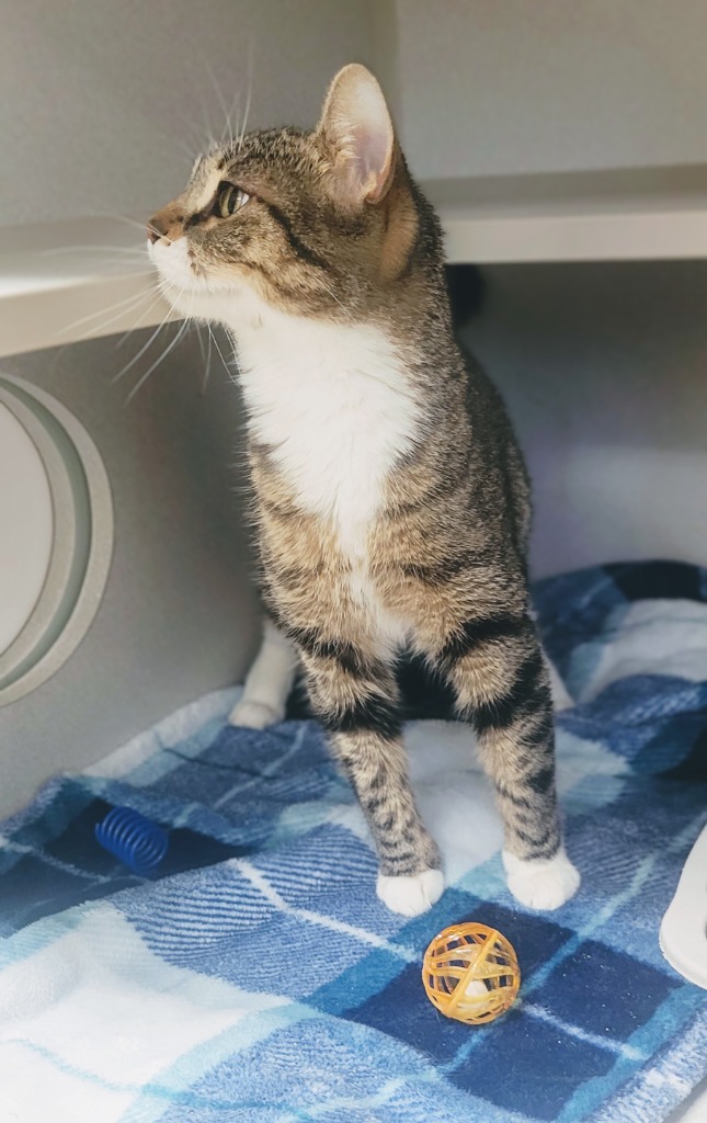 Bella is a sweet and curious girl who enjoys snuggles. She is a quiet kitty, who doesn’t meow but squeaks when she has strong opinions about something- usually closed doors and food. She is playful and will chase after anything, but is also content just napping by your side. She likes to wind down for the night by getting the zoomies and running around, but will settle down once she tires herself out for the night close by. While she is not declawed, Bella is mindful of her claws and teeth when playing. Her hobbies include making biscuits and watching out the window. Bella is an up and coming adventurer and she loves to explore. She can open some drawers and knows how to push or pull open ajar doors. She can be shy around people and loud noises, but usually overcomes her fears in the desire to be pet. Bella gets along with other cats and dogs.