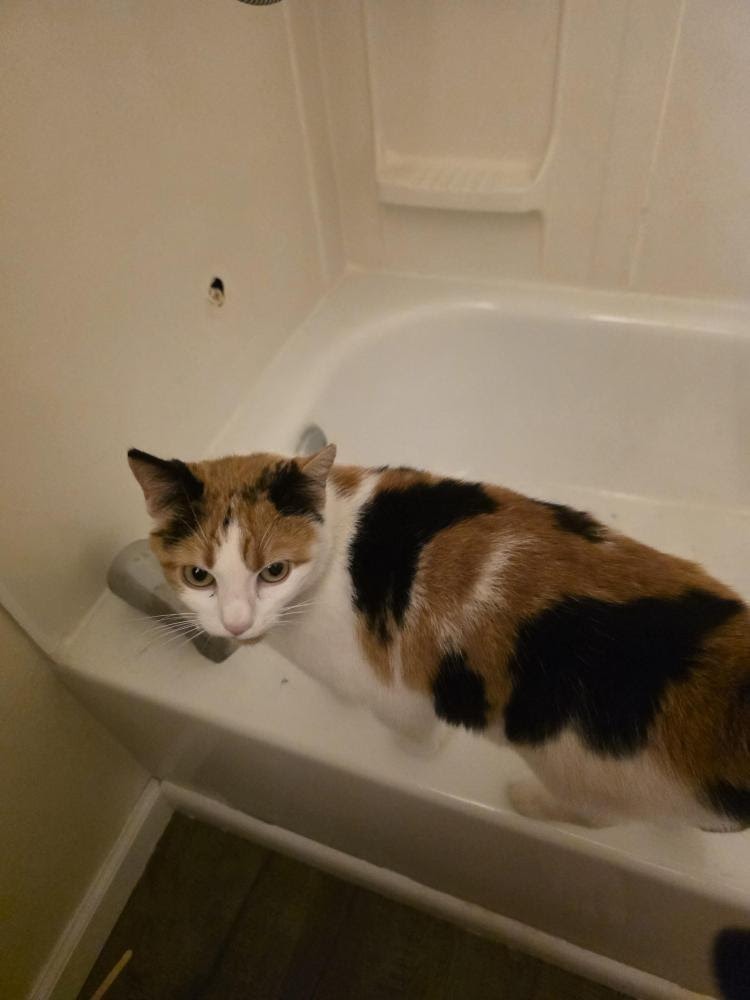 No collar, no microchip, Brown patch under chin, very people friendly