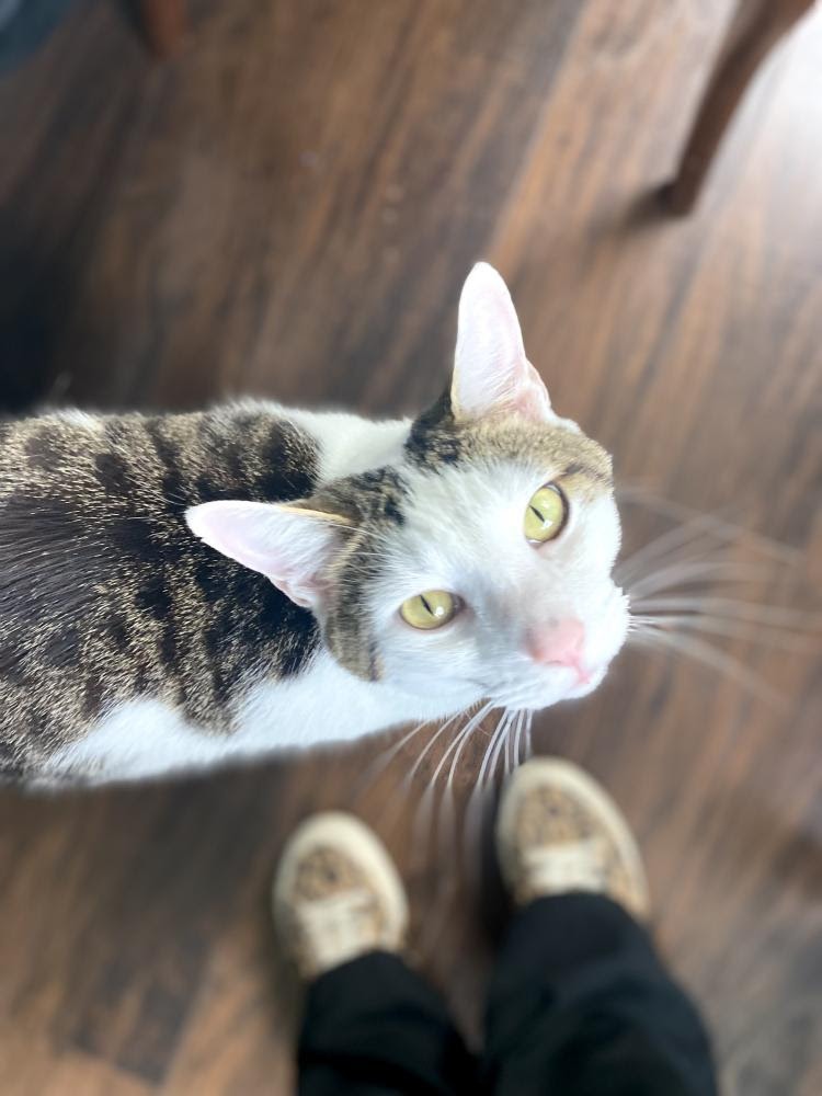 Goose, 4yr, male/neuter, chipped, tabby with white, raccoon tail, loud meow, friendly, green eyes, black and white markings