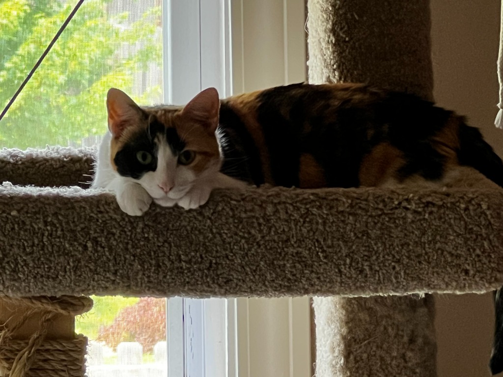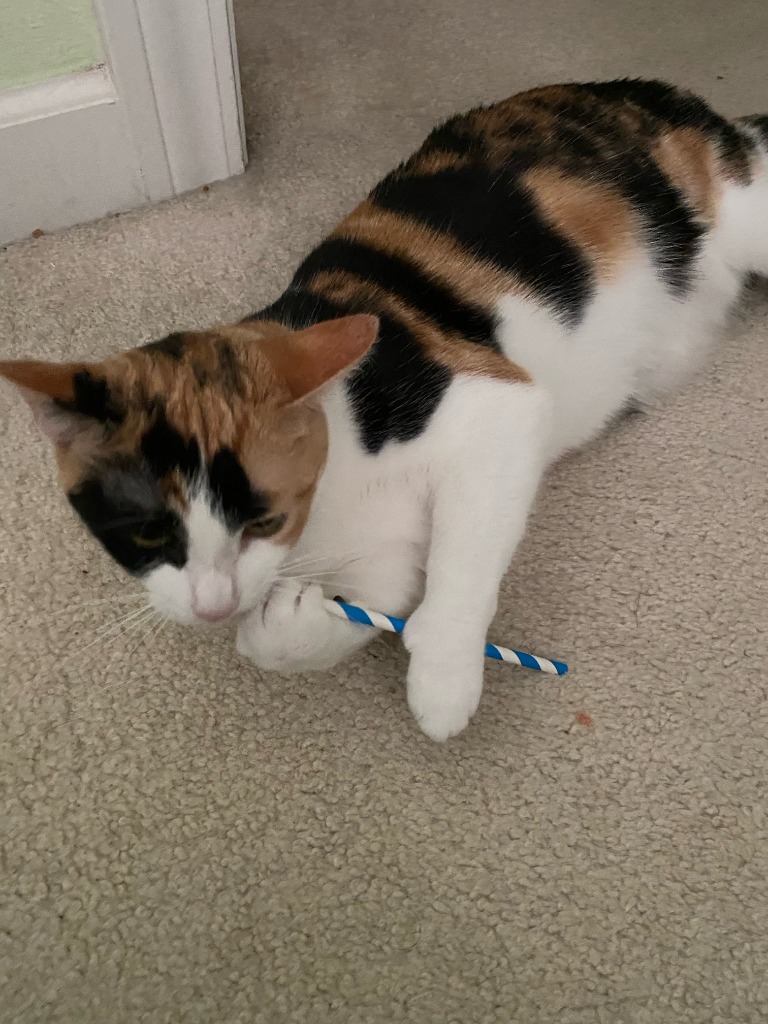 Peanut is a very sweet cat that enjoys watching birds through the window, sleeping under blanket forts on couches, and playing with paper straws under doorways. She isn’t really a lap-cat, but does generally want to be around people to see what they’re doing. She gets a little too excited around other cats, so would probably be better off in a single-cat home. She’s social with people, but has not been around children or dogs. She likes freeze-dried chicken and drinking from faucets (or cups), but also does fine with cat water fountains. She also enjoys chasing things, especially if they’re flying (like frisbees). Overall, Peanut is just a very sweet cat that would love a quiet home where she can be the only cat and watch animals outside, chase toys, and sleep all day. If that sounds like your home, Peanut would love to meet you!