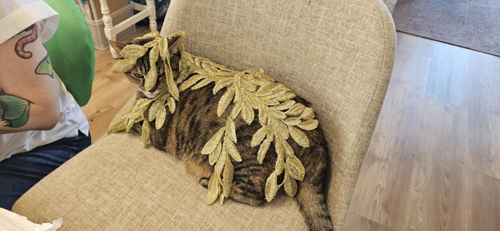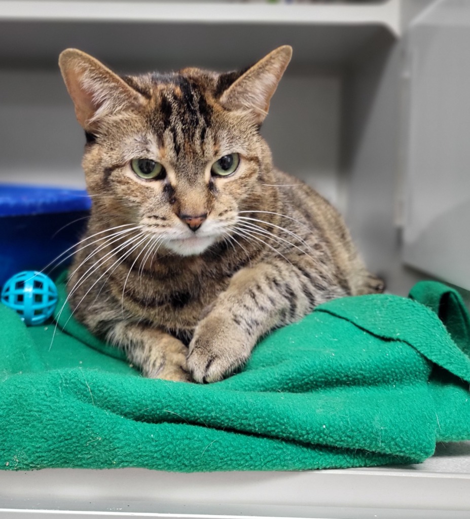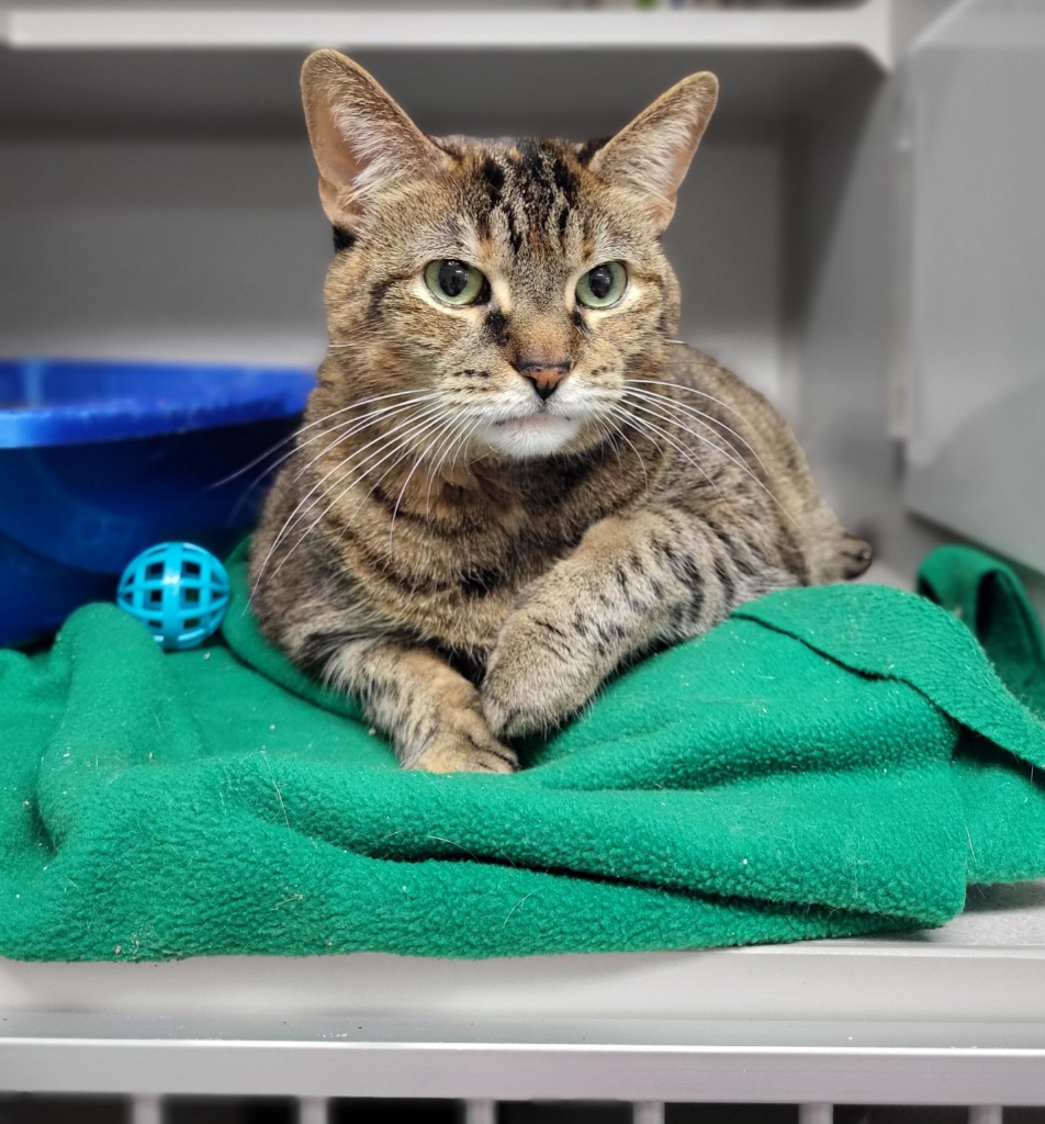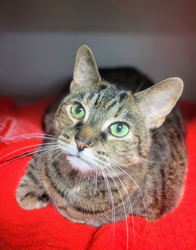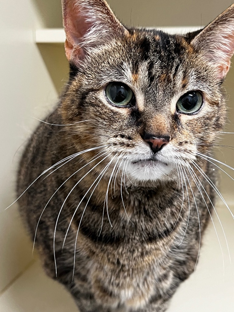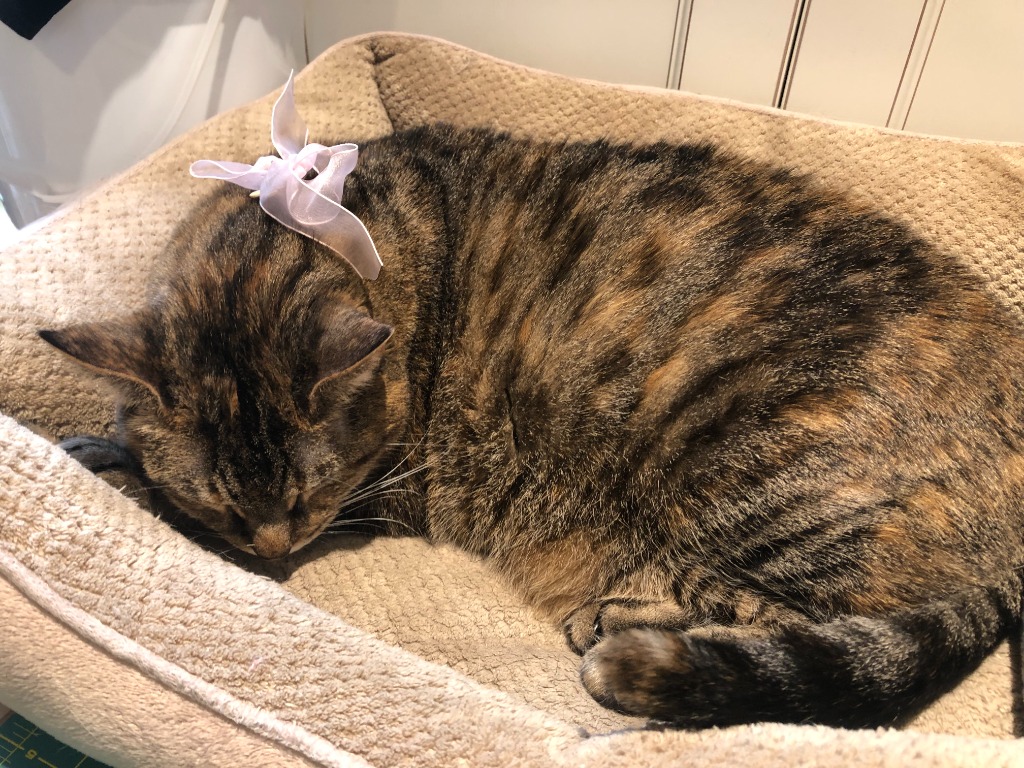Karen currently resides at Bloomington Stitchery, but is still available for adoption! This is what they have to say about her: Karen believes that Bloomington Stitchery exists only as a shrine to her exquisite beauty (because we tell her that she’s the most beautiful girl in the world, everyday). She has many devoted fans who visit her on a regular basis, and she is a very vocal friend to everyone she meets. Once you gain her trust, she will demand to be carried around while you dance to her favorite song, “Just The away You Are” by Bruno Mars, while she gives you ten thousand forehead kisses. Karen has been working on her “bad habits”, and has largely replaced swatting with giving even more kisses. This lovable, bossy, and fashionable lady deserves to live the cozy life in a forever home with her new favorite person. Come visit Karen at Bloomington Stitchery today!